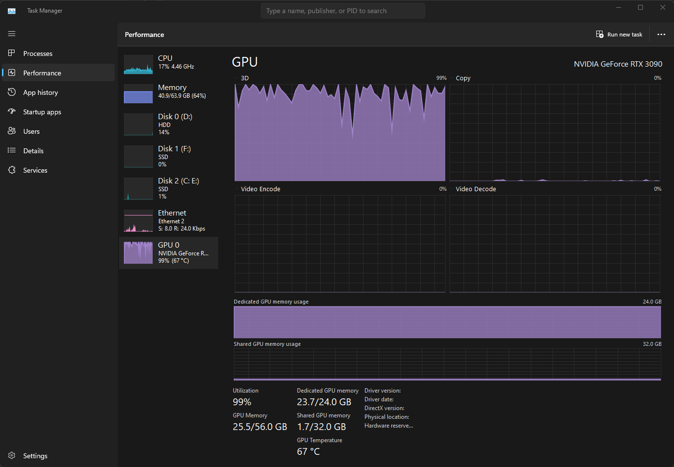 To train a model you need a GPU with a high amount of RAM. I am currently using an RTX 3090 GPU locally which provides me with 24GB of RAM in total and some shared RAM which I am not able to access since I am running this on WSL 2.