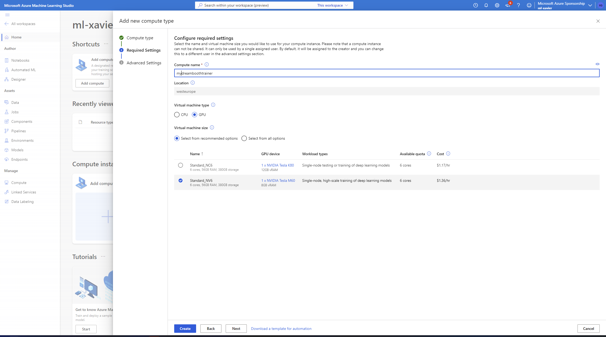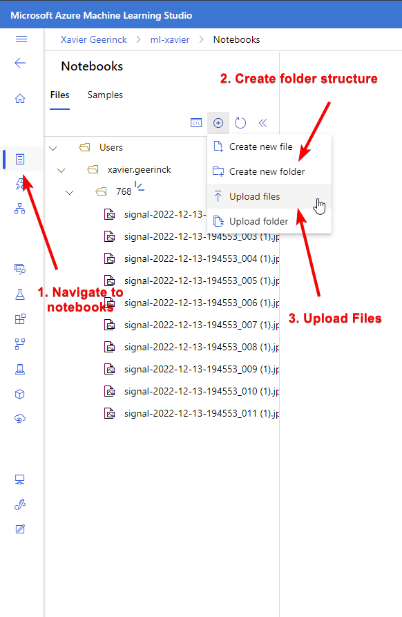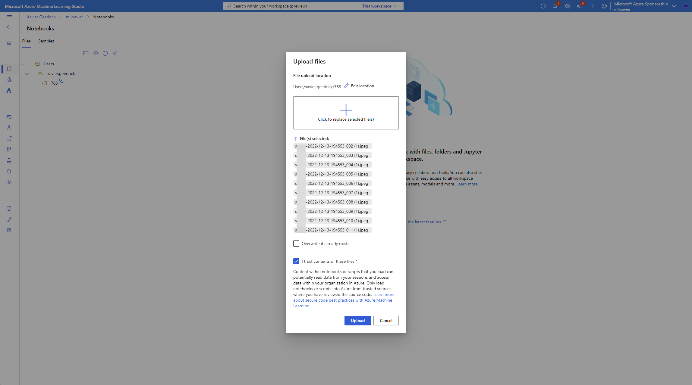Meanwhile, while the compute is spinning up, navigate back to home and open up the notebooks tab and upload your files to a folder. (I picked 768 noting the resolution)