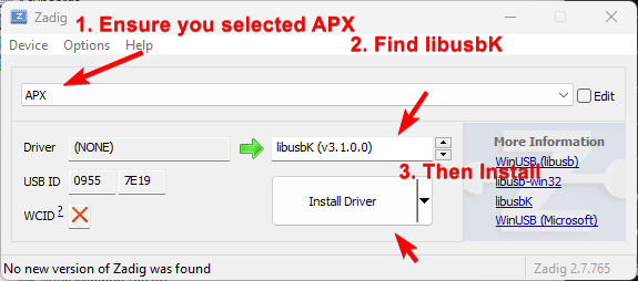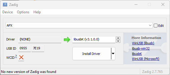 We can ensure this device is recognized by installing the Zadig tool that allows us to use a generic driver (e.g., libusbK)