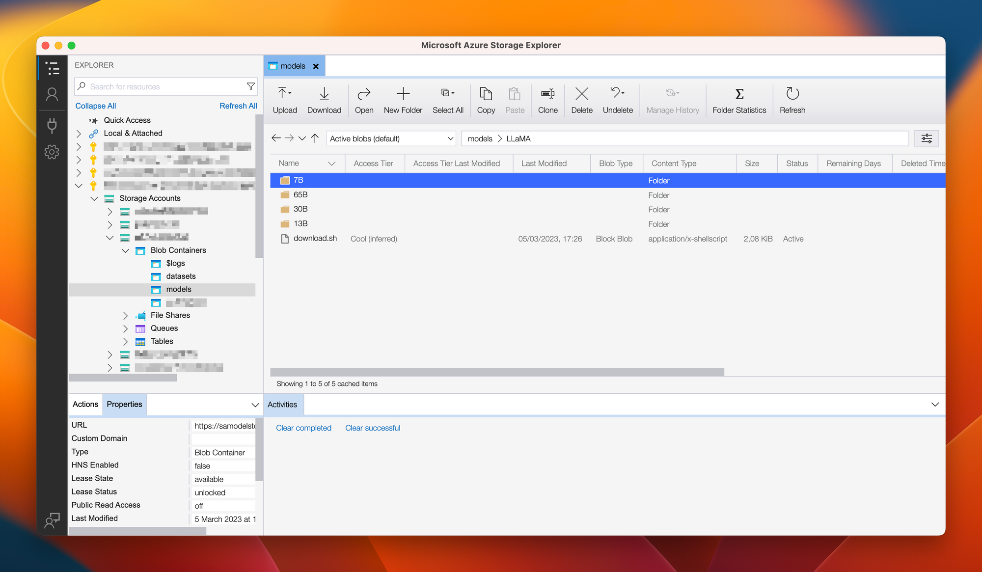 The above will then download all the files and reupload them to Azure. When checking our result with the Azure Storage Explorer, we can see something like the below. Containing ~100GB of model files!