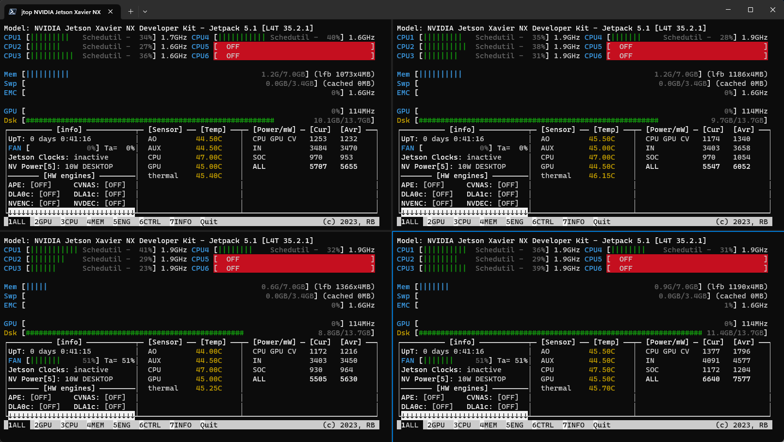 Finally, I installed jetson-stats on each module (jtop) to provide deeper insights of what the node is doing.