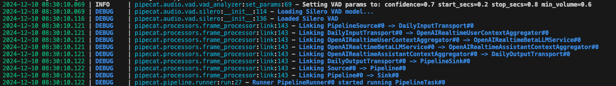 pip install "pipecat-ai[daily,elevenlabs,silero,openai]" python-dotenv loguruOnce we have this, put the below in a file named demo.py: