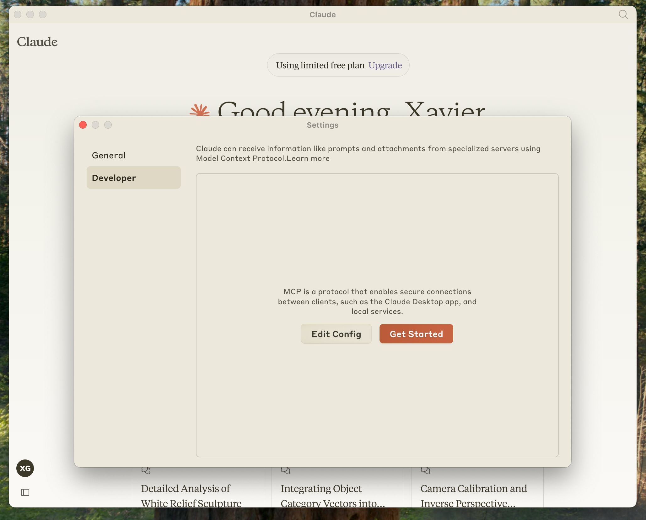 For filesystem operations, Antrophic created the Filesystem MCP. So let's enable it by opening up the Developer Settings panel within Claude and edit the claude_desktop_config to create an MCP Server configuration.