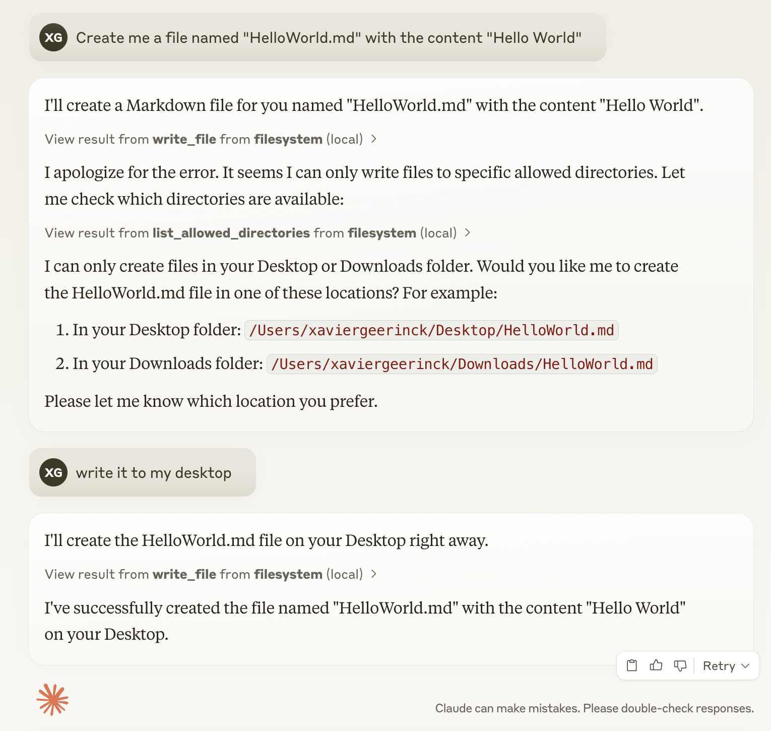 For this example, let's see how we can use an MCP Server to create a file named "HelloWorld.md" with the content "Hello World, my name is Xavier".