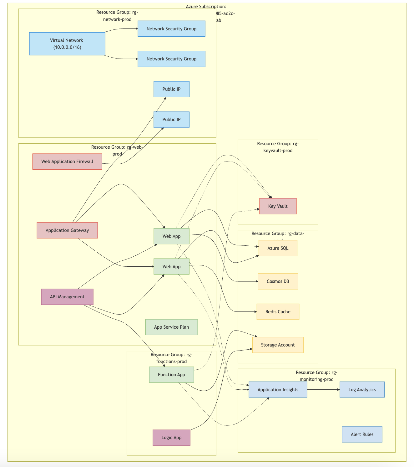 Now when we launch Claude, we will see all the tools available! Running a prompt such as Generate me an architecture of all my resources and dependencies in Azure for the subscription "<SUB_ID>". Print it as a Mermaid diagram. will beautifully render the below!
