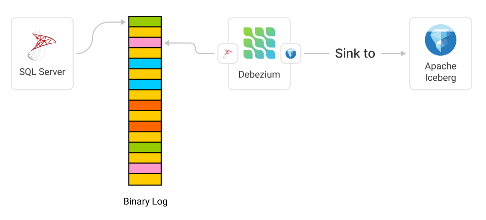 Looking at the architecture, we will then have SQL Server that writes the latest changes to its LOG file, whereafter we have Debezium monitoring this log and replicating it to our Apache Iceberg installation.