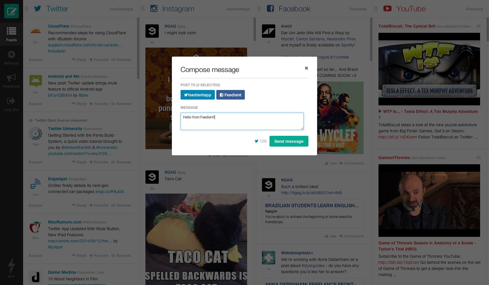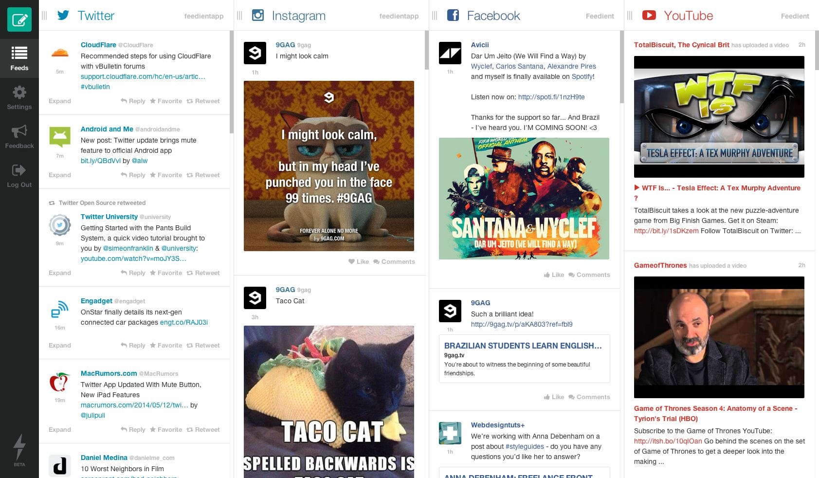 Feedient was a social media aggregator which goal was to unify and gather all social feeds into one easy-to-use overview. The platform was developed as a clean and minimalistic modern web application with support for six content providers; Facebook, Twitter, Instagram, YouTube (subscription feed), Tumblr and RSS. The social feeds were presented side-by-side as an overview and utilized modern real-time streaming techniques for content updates.