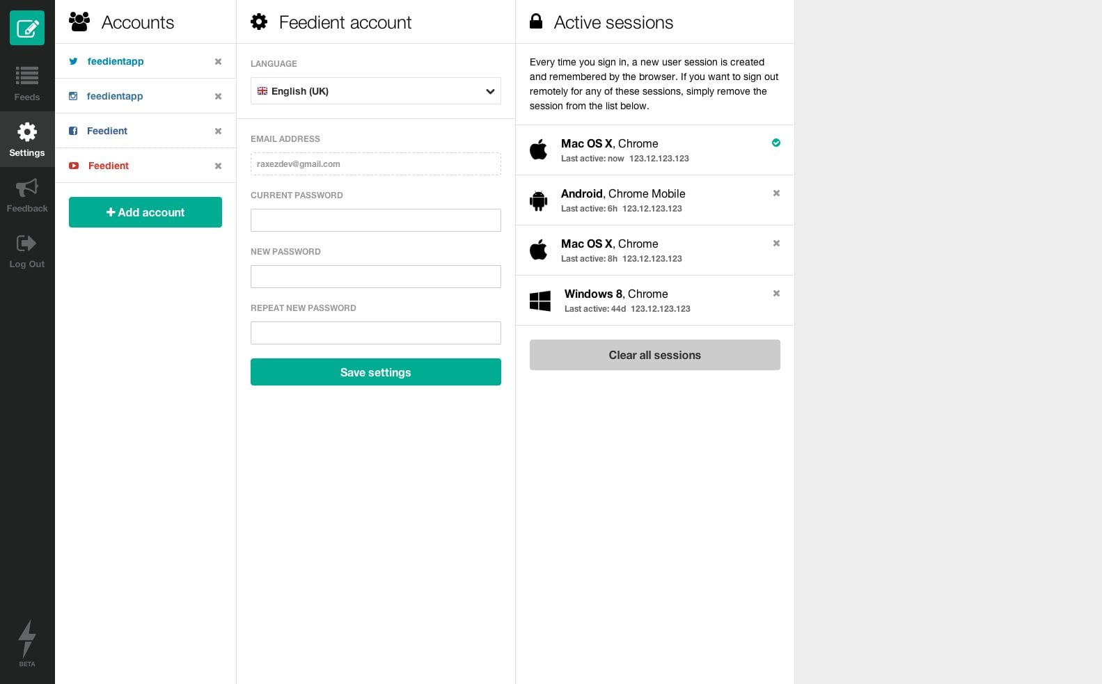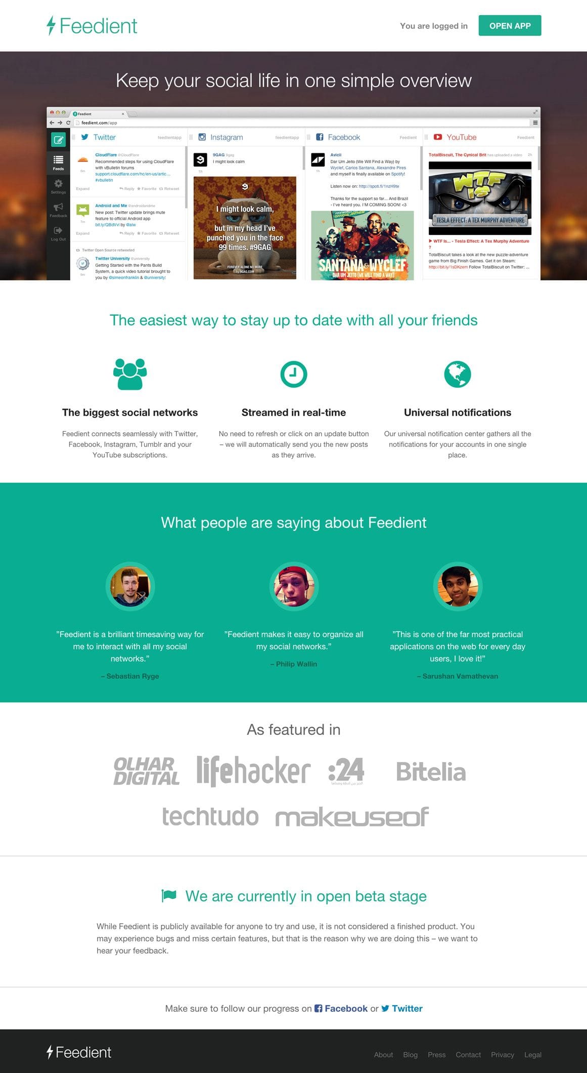 Feedient launched its public beta in April 2014 and was shut down a year later, in April 2015, partly because of increasingly tough third-party restrictions from the social networks (read all about it). During this year we obtained about 80 000 unique visitors, peaking at about four hundred concurrent visitors. Collectively all visitors spent a jaw-dropping 26 years of time using our service, at one hour per visit on average – something which we’re immensely proud of. We were also featured in tech publications such as Lifehacker and Olhar Digital by Brazilian UOL.